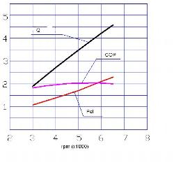 Kälteleistung und Leistungsaufname in kW, COP) als Funktion der Drehzahl bei